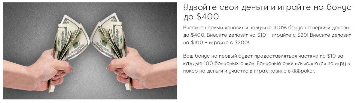 Для того чтобы иметь возможность получить бонус, нужно зайти в финансовый раздел в десктопном или мобильном приложении 888 покер и произвести платеж на сумму, превышающую 10 долларов. Стоит также не забывать, что максимум бонуса закреплен на уровне 400 долларов. В том случае, если вы внесете сумму, превышающую данную отметку, то вы все равно получаете бонус, однако рассчитываться он будет, как если бы вы внесли те же самые 400 долларов.