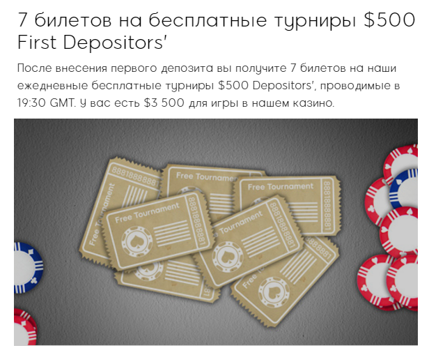 - First Depositors’ Challenge Tournament – 1 штука. Этот билет дает вам пропуск на фриролл, который проходит в пятницу для тех игроков, которые внесли первый депозит.