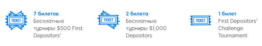 За это на счет нового клиента приходит 2 билета на подобные турниры. К слову, все последующие депозиты клиента также поощряются различными турнирными билетами. Однако такую «награду» можно получить только 1 раз в неделю, даже если вы вносите депозит на свой игровой счет чаще.