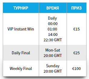 - 3 билета VIP Instant Win – это билеты на фрироллы (бесплатные турниры). В этих турнирах можно выиграть приз до 15 евро, а участие является ограниченным.