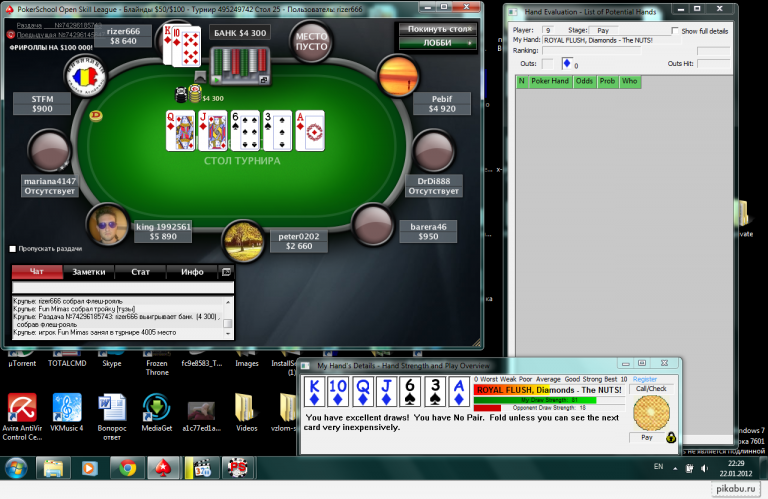 Если карты будут идти по порядку, например: тройка, четверка, пятёрка, шестерки и семерка пик, то это будет Стрит Флеш. Набор самых старших карт по порядку одной масти будет называться Роял Флеш. Это лучшая комбинация в покере. Например: десять, Валет, Дама, Король и Туз одной масти. Важно помнить, что в покере все масти разнозначны.